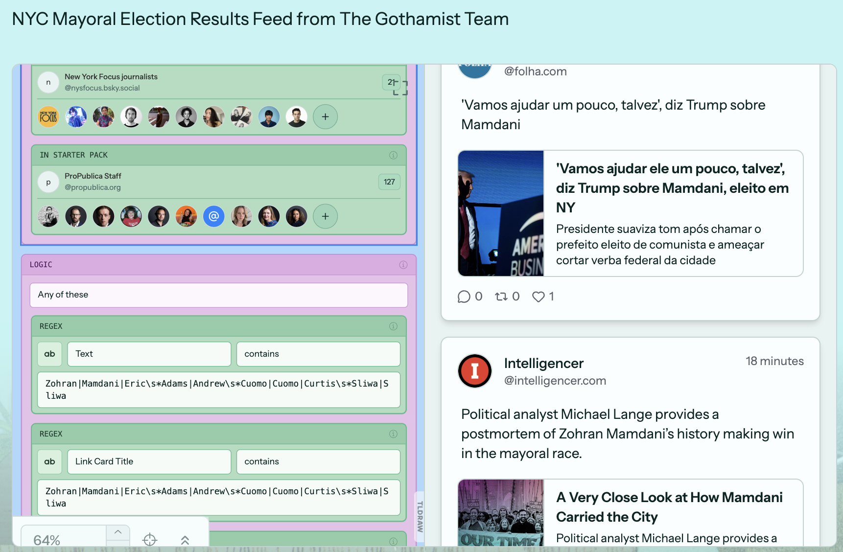 The feed starts with a wide number of sources, including individual accounts selected by Gothamist, starter packs, and a dozen or so lists totaling hundreds of sources — far too many to follow on their own if you're only interested in a particular story. By layering on search terms that pull out posts relevant to the election and then sorting by most recent, the feed shifts from being an illegible flood of posts to a useful and relevant curation of information. It's complex, yet completely transparent, and the resulting feed has been invaluable for providing a real-time view of the race and the reporting that's followed.